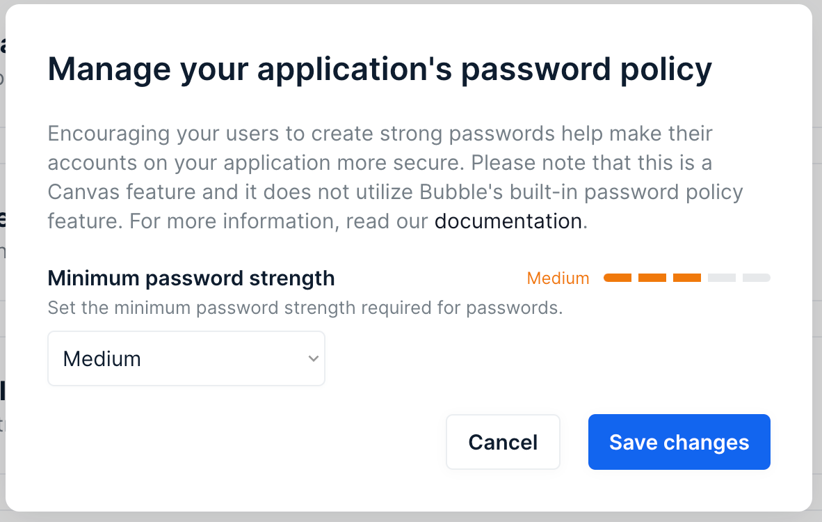 This Canvas feature uses Bubble's password strength feature and not Bubble's built-in password policy feature (App Bubble editor > Settings tab > General tab > Privacy & Security section).