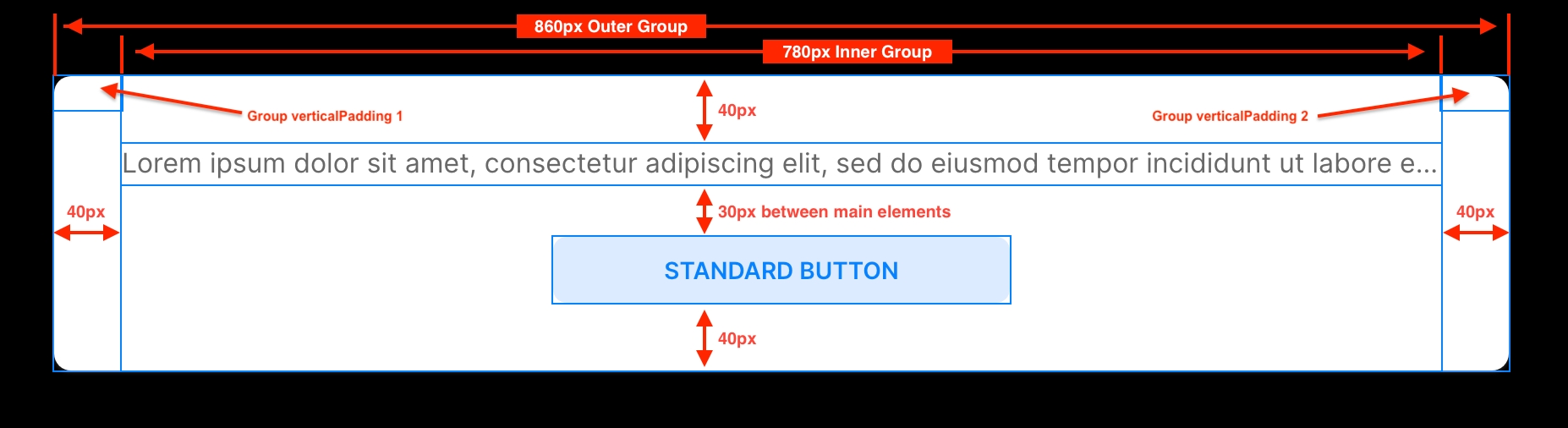 Padding Groups: There are two groups called Group verticalPadding 1 and Group verticalPadding 2 which are located at the top left and right of the outer group. These groups have a standard width of 40px, a minimum width of 50%, and no maximum width set and are used to maintain a dynamic padding distance between edges of the outer group and the inner group.