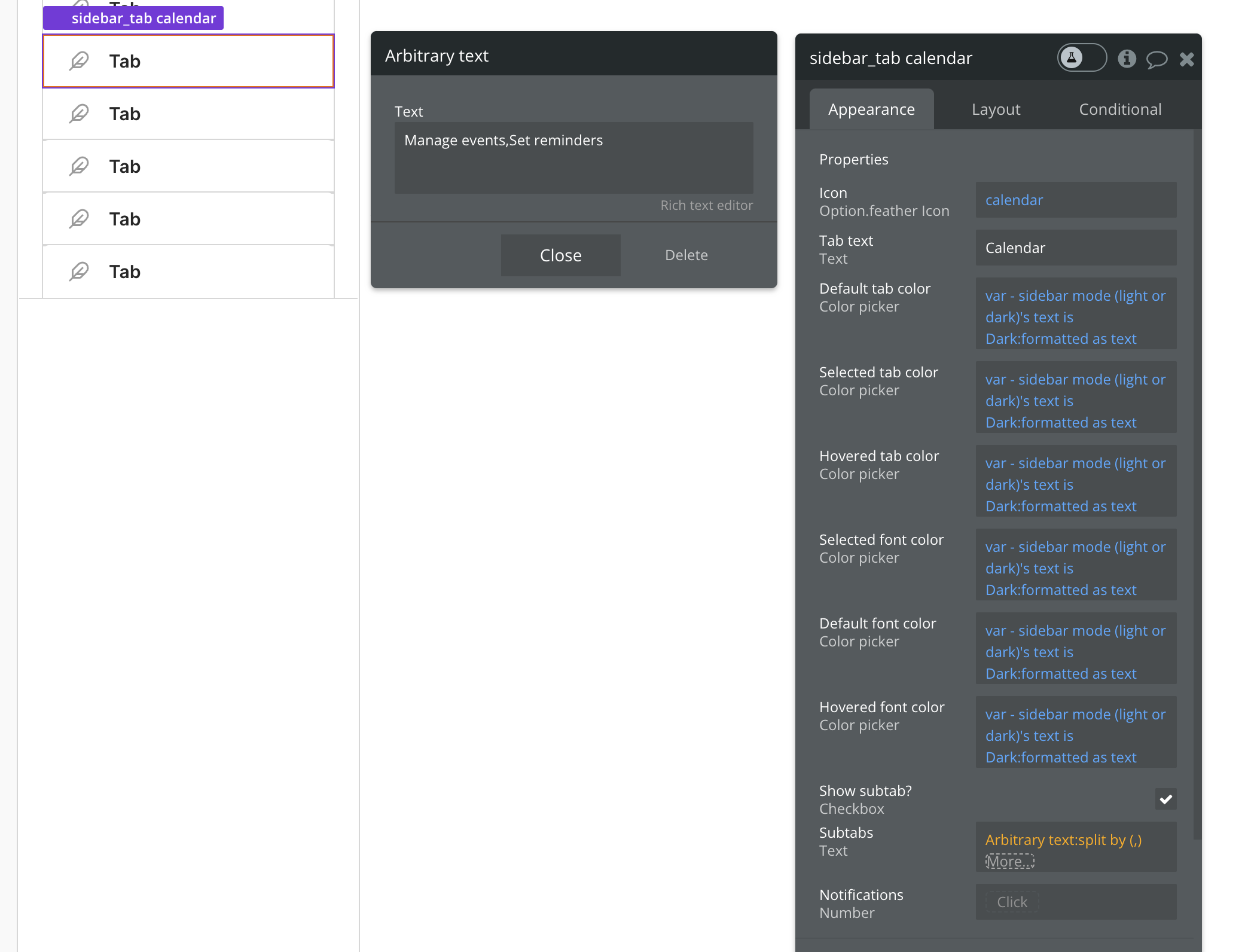 **Overview:** Used as sidebar tabs in the admin page and standard portal pages. You can copy and paste an existing sidebar\_tab and define the [reusable element properties](https://manual.bubble.io/core-resources/elements/reusable-elements#reusable-element-properties) below: