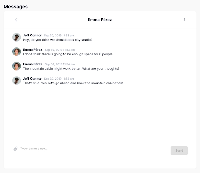 Clicking on Group Inner Back to threads will navigate back to the list of threads. The user can enter a message in MultilineInput message and attach a file by clicking on the file clip icon. When an attachment is added, it will show underneath the message input. Clicking on it will open the attachment in a new tab for previewing. Clicking on Group Inner delete file will delete the attachment and allow you upload a new attachment.