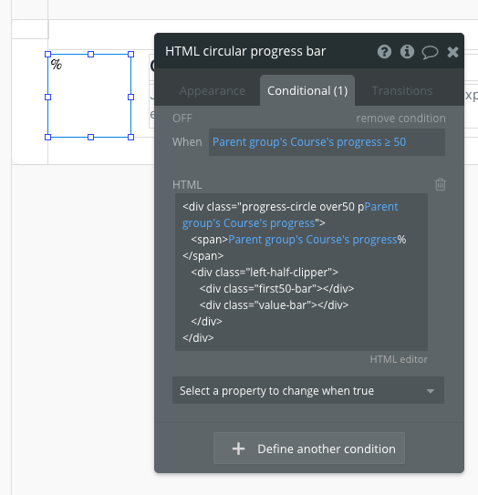 First, select HTML circular progress bar and you'll see the following code (bolded text represents where you'll input dynamic data): <div class="progress-circle p10" width=> <span>10%</span> <div class="left-half-clipper"> <div class="first-50-bar"></div> <div class="value-bar"></div> </div> </div> There is also a conditional statement that looks a bit different: <div class="progress-circle over50 p10" width=> <span>10%</span> <div class="left-half-clipper"> <div class="first-50-bar"></div> <div class="value-bar"></div> </div> </div>