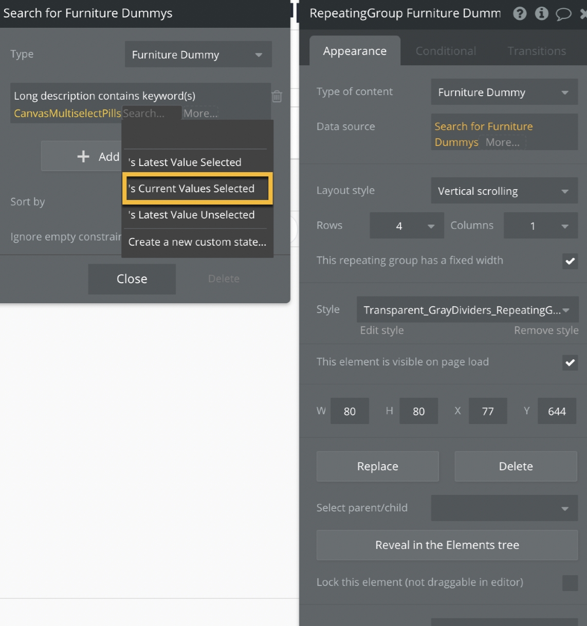 If you are using this element to filter a repeating group, add a constraint to your repeating group, which utilizes the "Current selected" state of the plugin: