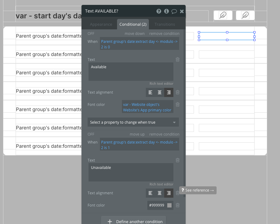 var - start dayto include any filters you needUpdate the placeholder conditionals on Text AVAILABLE? elements