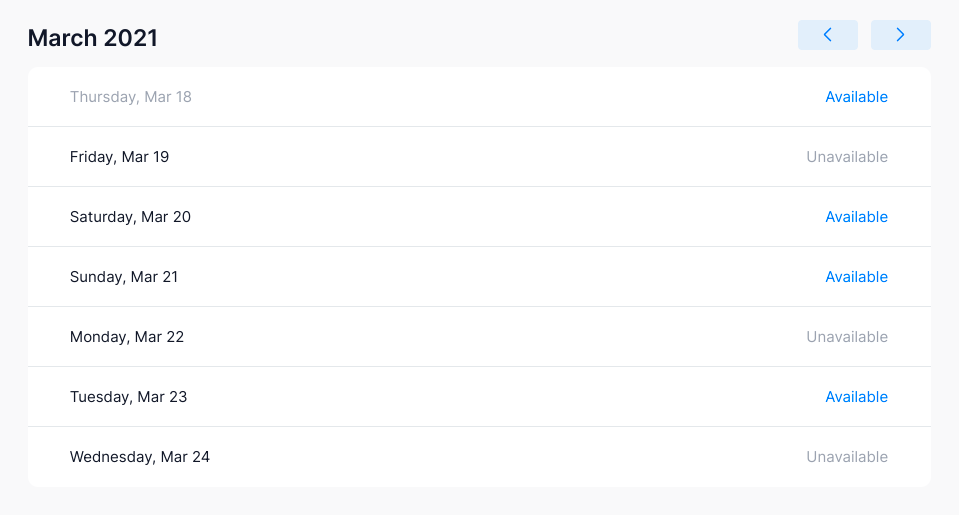 This block shows the availability of each day of one week at a time and allows the user to toggle left and right between weeks. Ideal for booking / Airbnb-type applications where you need to show a calendar for availabilities.