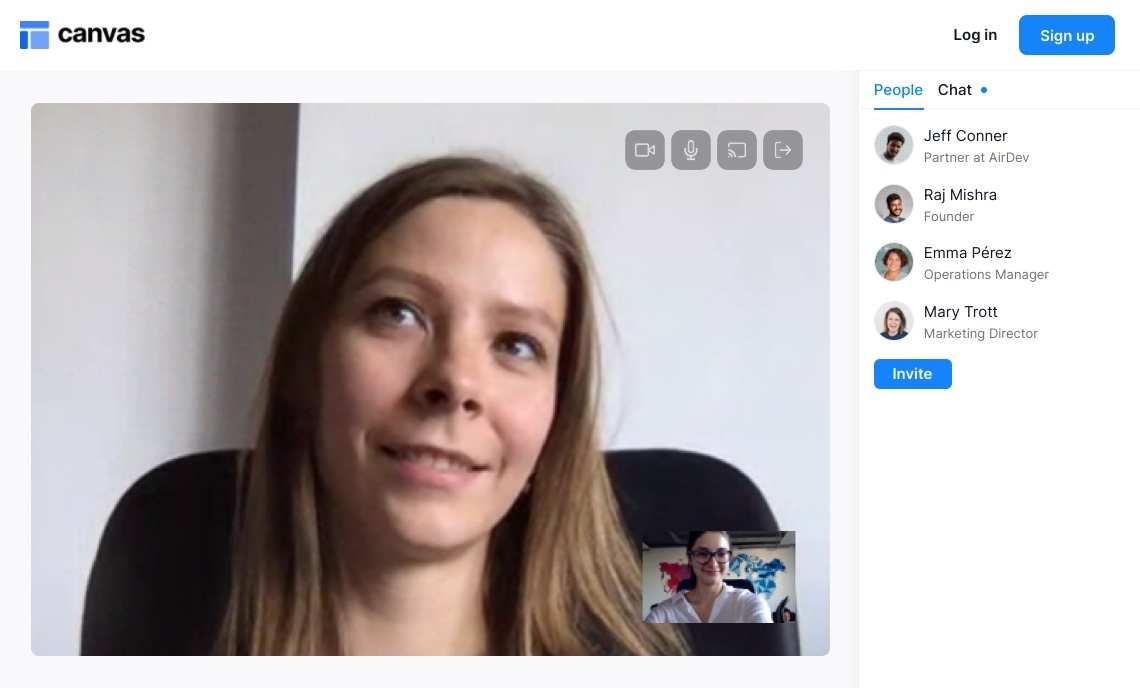 Responsive layout for a two-column video chat page. Includes UI for joining a video chat room and updating video settings (e.g., video on/off, mute on/off, screen share, and leave room). The sidebar includes UI to view/invite participants and a messenger to chat with other users in the room. This page template uses the Twilio Video Chat plugin created by Bubble. Please ensure you have added this plugin to your app before creating this page with Canvas Pages (Go to app Bubble editor > Plugins Tab > Add plugin).