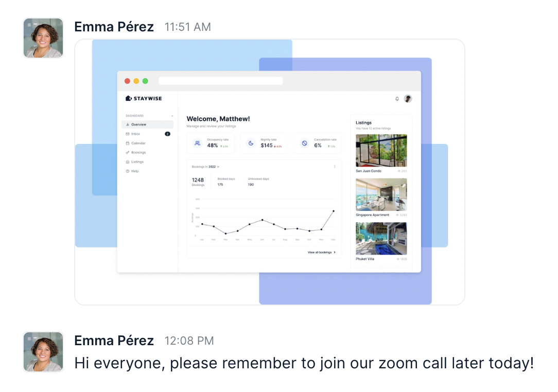 This page allows a user to manage multiple conversation threads with different users. A user can click into one of the threads and send or view messages/attachments.