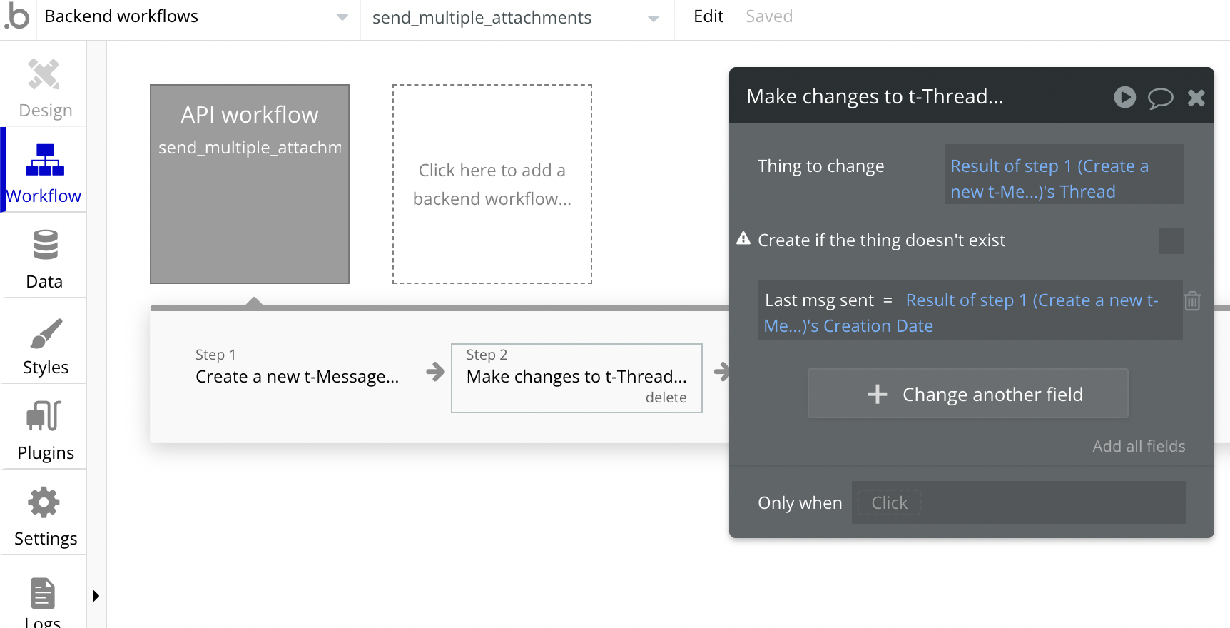 * By default, users can attach multiple attachments when composing a message. However, the workflows are currently set up to only send the first attachment in the attachments list (**RepeatingGroup file**). To send multiple attachments when you click **Group Main send msg button\_thread (action)**, it would be best to use an API workflow. Your Bubble app would need to be on a paid Bubble plan to use API workflows.