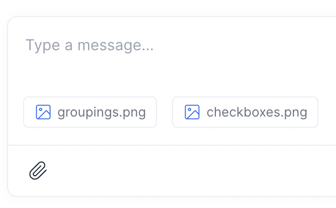 * **Group Main message input** includes the UI to compose a message, attach a file, and view file attachments. When an attachment is added, it will show underneath the message input. Clicking on it will open the attachment in a new tab for previewing. Clicking on **Group Inner delete file** will delete the attachment and allow you upload a new attachment.<br>