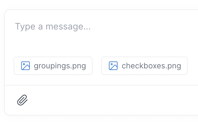 Group Main message input includes the UI to compose a message, attach a file, and view file attachments. When an attachment is added, it will show underneath the message input. Clicking on it will open the attachment in a new tab for previewing. Clicking on Group Inner delete file will delete the attachment and allow you upload a new attachment.