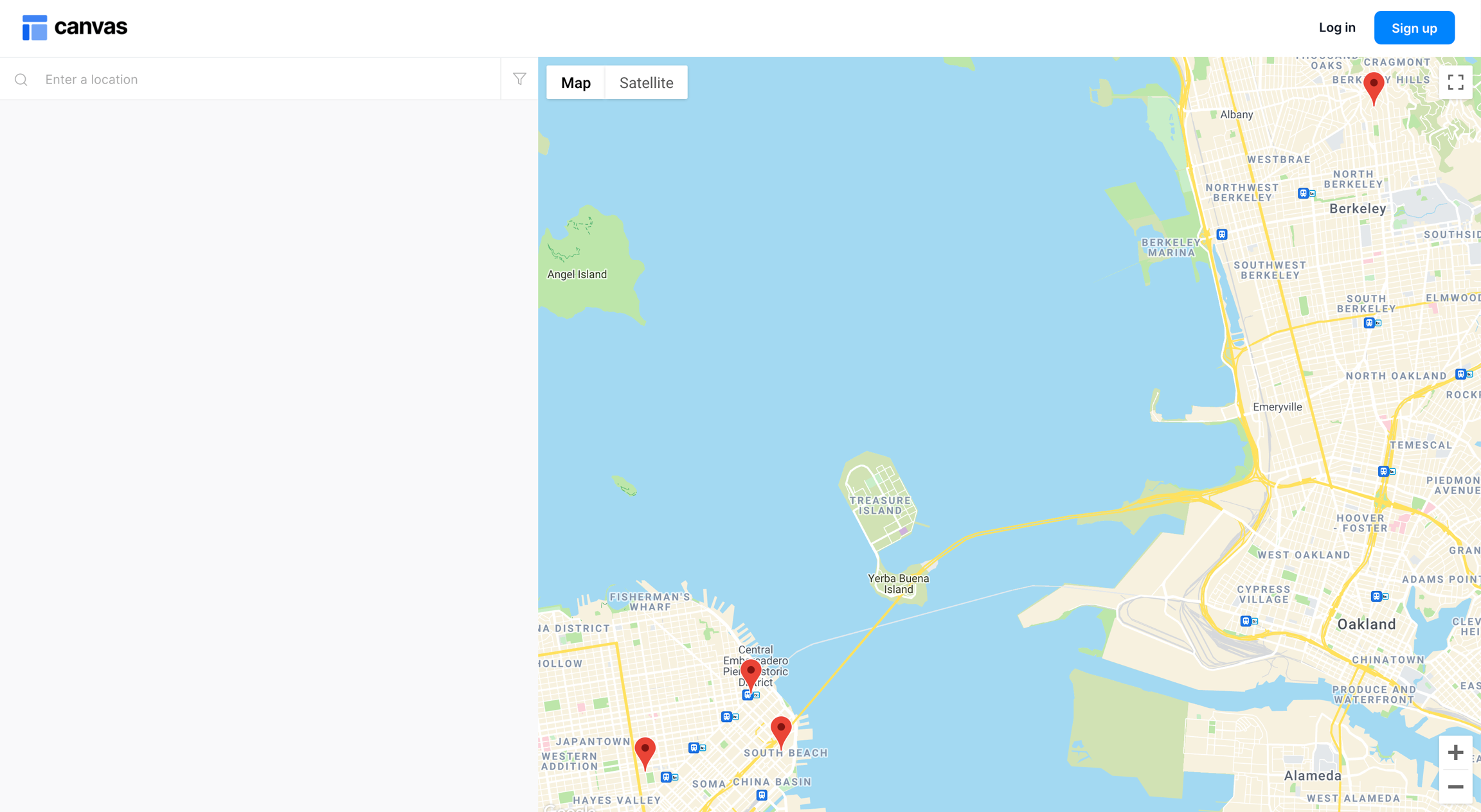 This page template includes a search bar element and a floating map that floats to the top and bottom of the page. You can add Canvas blocks to the left of the map; the map stays in a fixed position as you scroll the search results (similar to Airbnb).