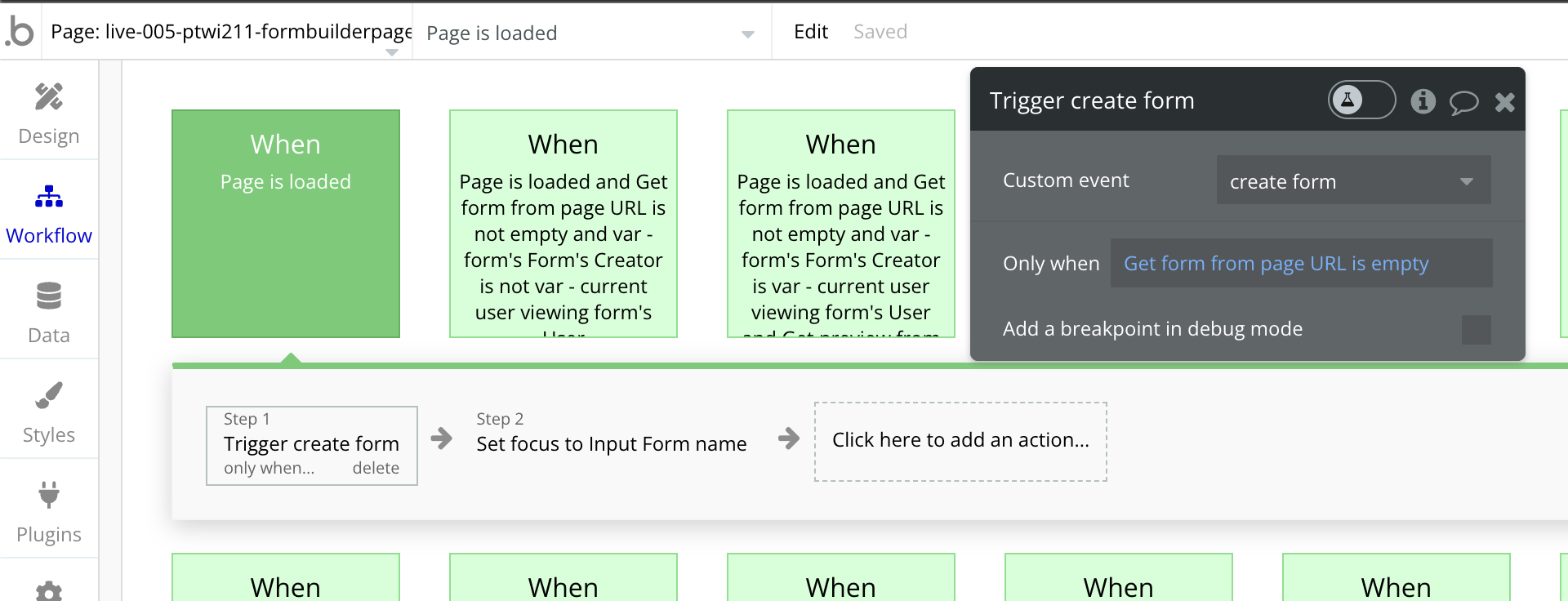 Locate the *page is loaded* workflow on the page and add an 'only when' for *Current user is logged in*. The conditional statement has been removed for demo purpose but to make your form more secure, the user should be logged in to create a form.