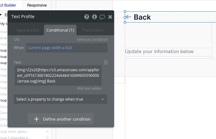 Each title group includes a conditional statement on the title. Update the page width conditional statement here to set when the back arrow shows up. When the title group is clicked, it will trigger a custom workflow called Mobile navigate. This will navigate the user back to the same page without any tab parameters.
