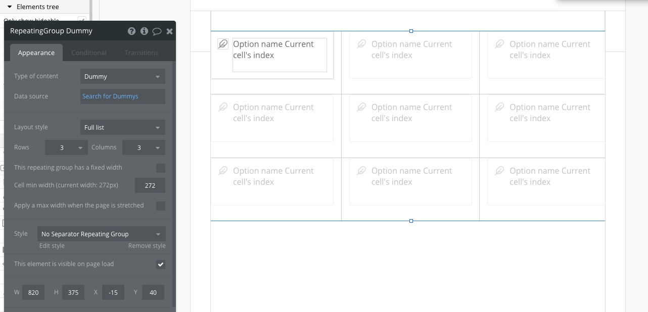 RepeatingGroup Dummy holds the data for the multi-select options (type Dummy). It also has a custom state on it for the user's list of selected options.
