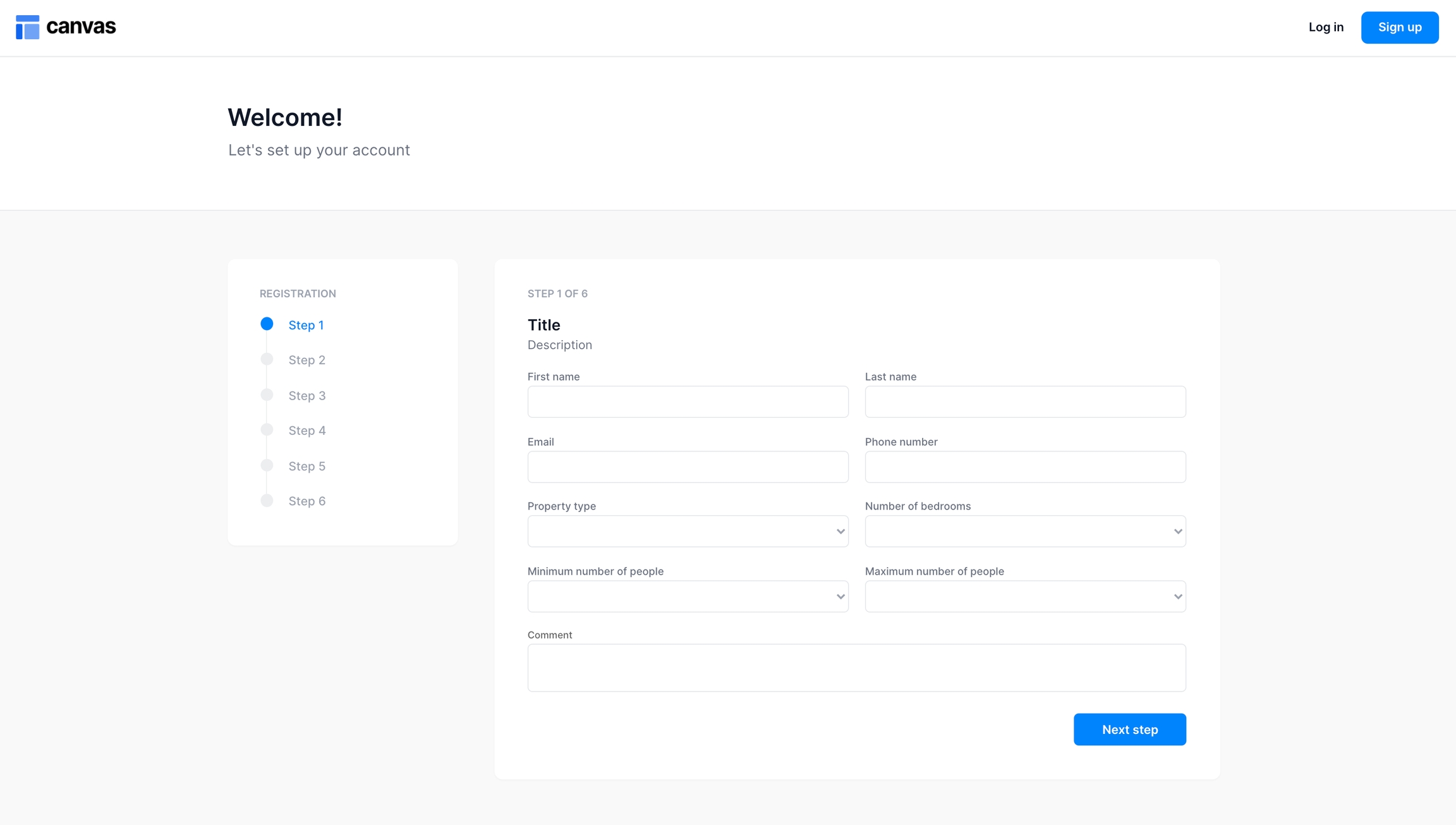 This page includes a series of groups and a progress bar. Users can go back and forth between steps using the "Back" and "Next" buttons. Users can also change steps by clicking on one of the left-side tabs. This page is best used for complex onboarding processes and complex intake forms.