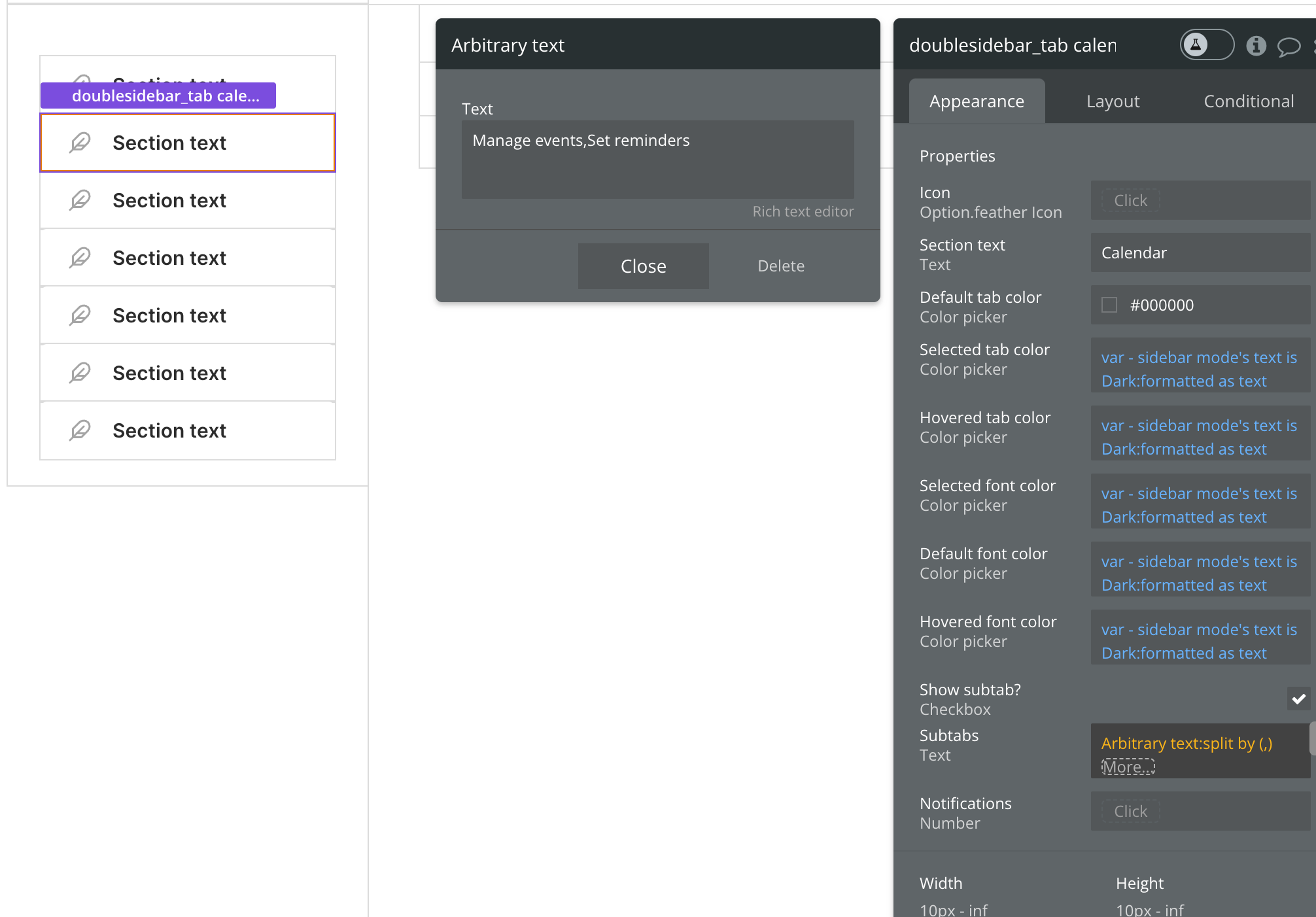 Overview: Used as sidebar tabs in Double Sidebar Portal page templates. You can copy and paste an existing doublesidebar_tab and define the reusable element properties below: