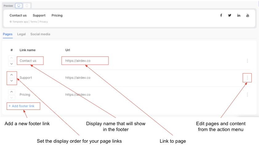You can set up links to any page you like in the pages tab. These can be the same pages you set up in the header or completely different.