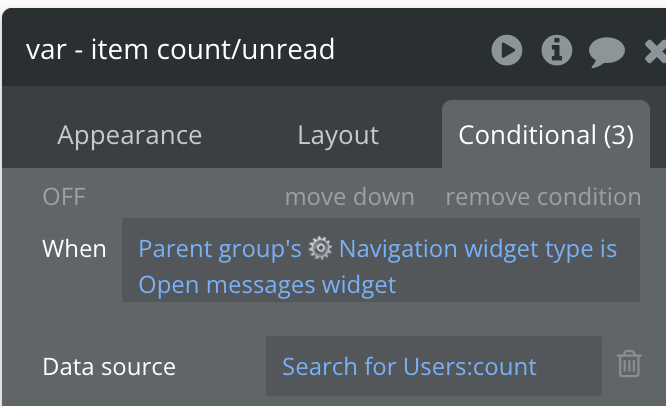 To set up the badge value, open the **widget\_icon\_actions** reusable element and find a group called **var - item count/unread**. Go to the conditional tab to see placeholder conditional statements.