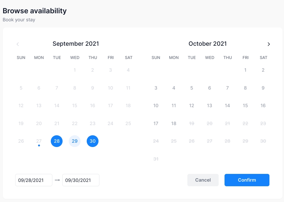 When a user selects a start date of Sep 26, then the user can only select a start date after the end date of a previous booking (e.g, Sep 24) and select an end date up until the start date of the next booking.