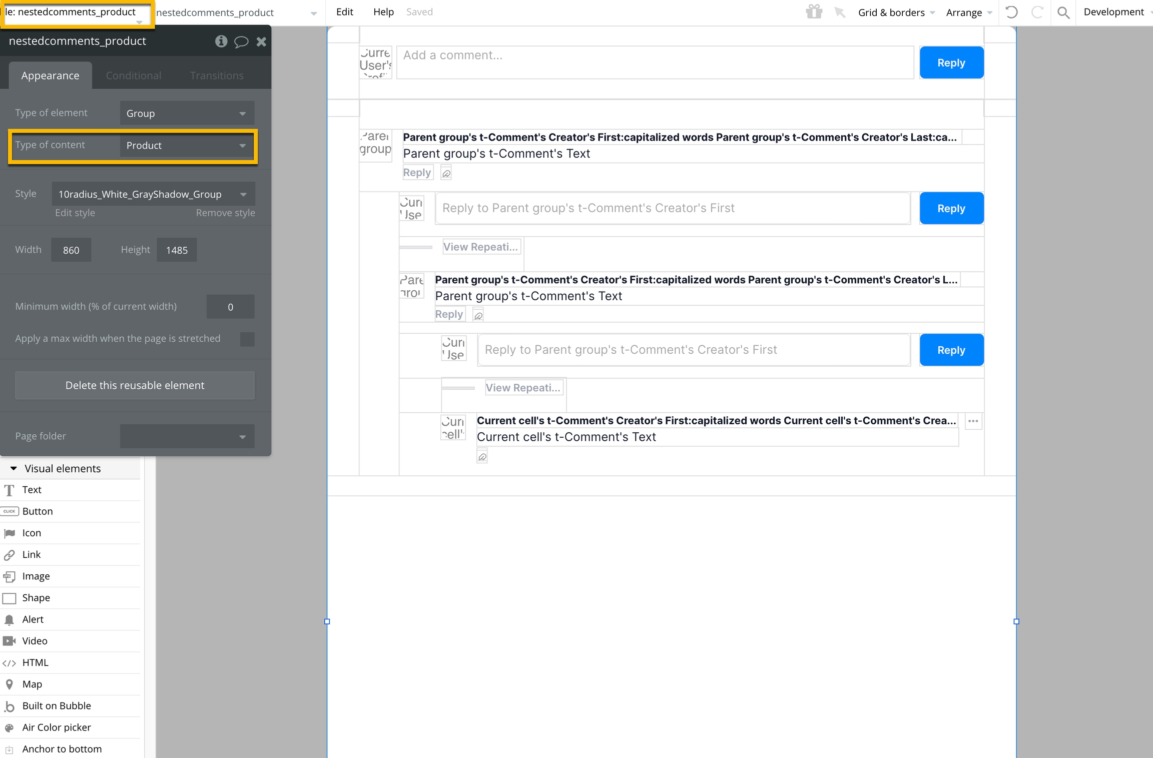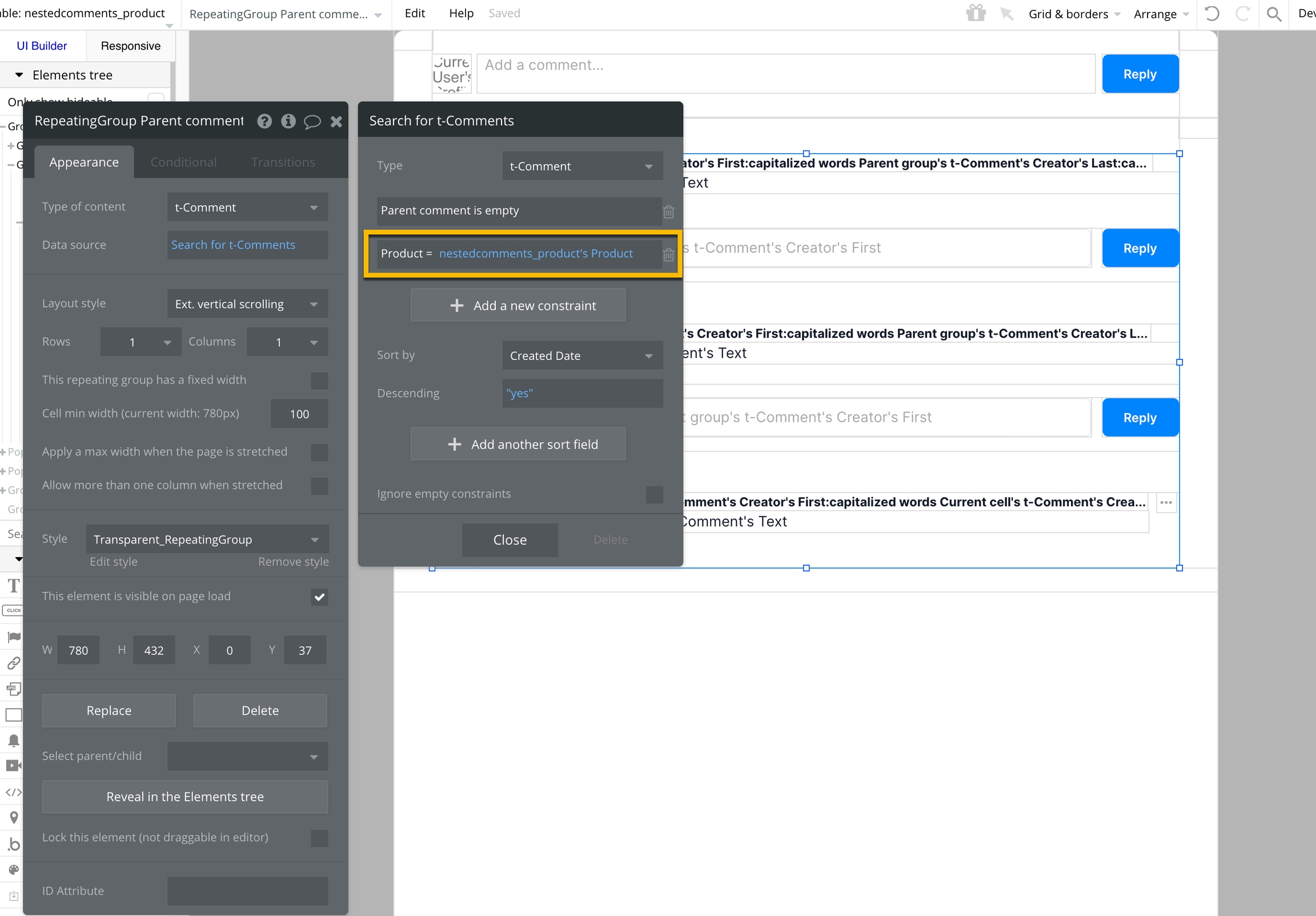posted by users (where the parent comment is empty).RepeatingGroup Child comment displays all children comments (where the parent comment is parent group's comment).
