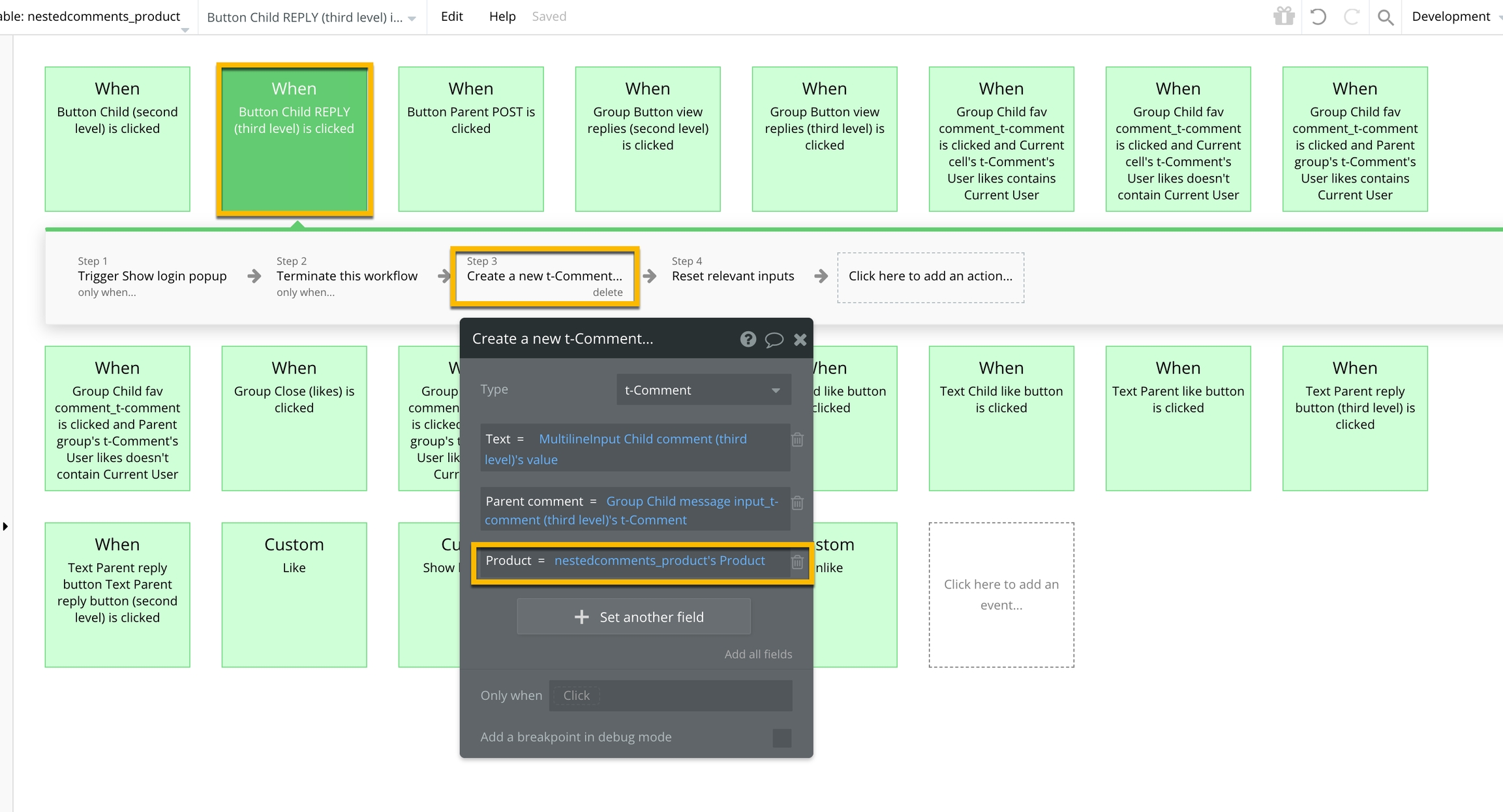 Modify the three actions that run when the Button Parent POST, Button Child REPLY (second level), and Button Child REPLY (third level) elements are clicked to link the