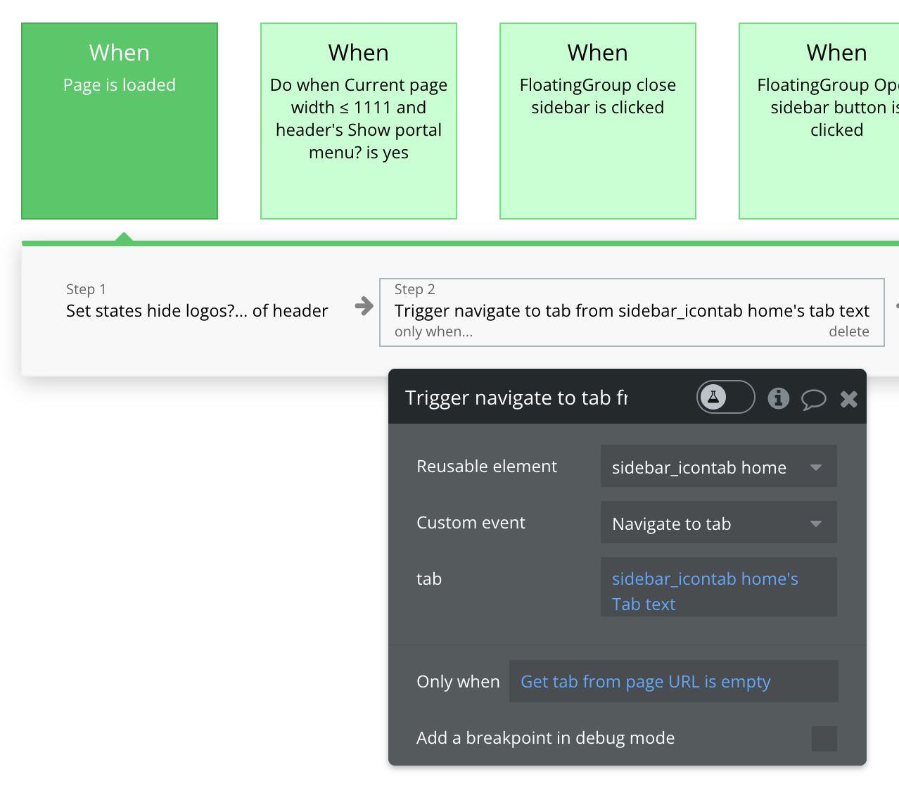 * Within **Floatinggroup Sidebar\_app settings (icons)** and **Floatinggroup Sidebar\_app settings (text links)**, you will find various reusable elements called **sidebar\_icontab \[name]** and **doublesidebar\_tab \[name]**. To customize these tabs, simply update each tab's reusable properties.