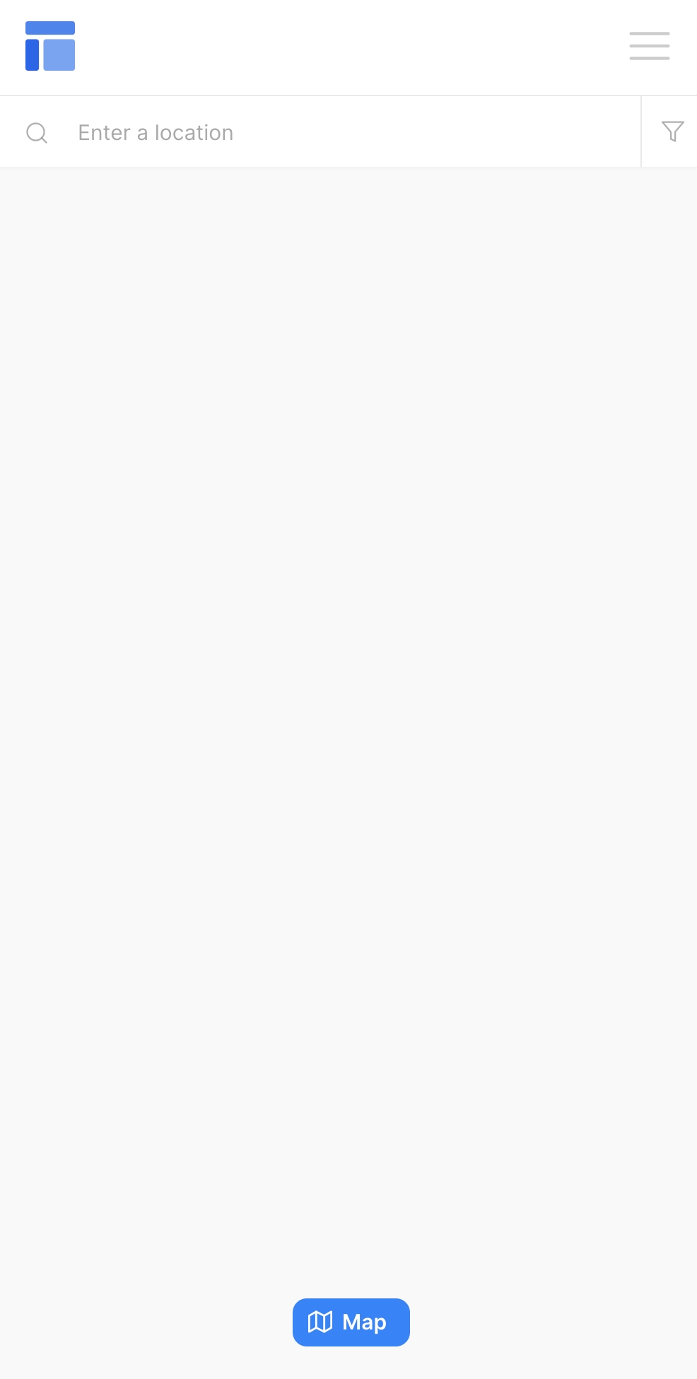 This page template includes a search bar element and a floating map that floats to the top and bottom of the page. You can add Canvas blocks to the left of the map; the map stays in a fixed position as you scroll the search results (similar to Airbnb).
