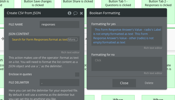 * Since you added a new question, we need to include that in the form response CSV download. Go back to the form builder page and find the workflow for when '*Button Download is clicked*'.<br>