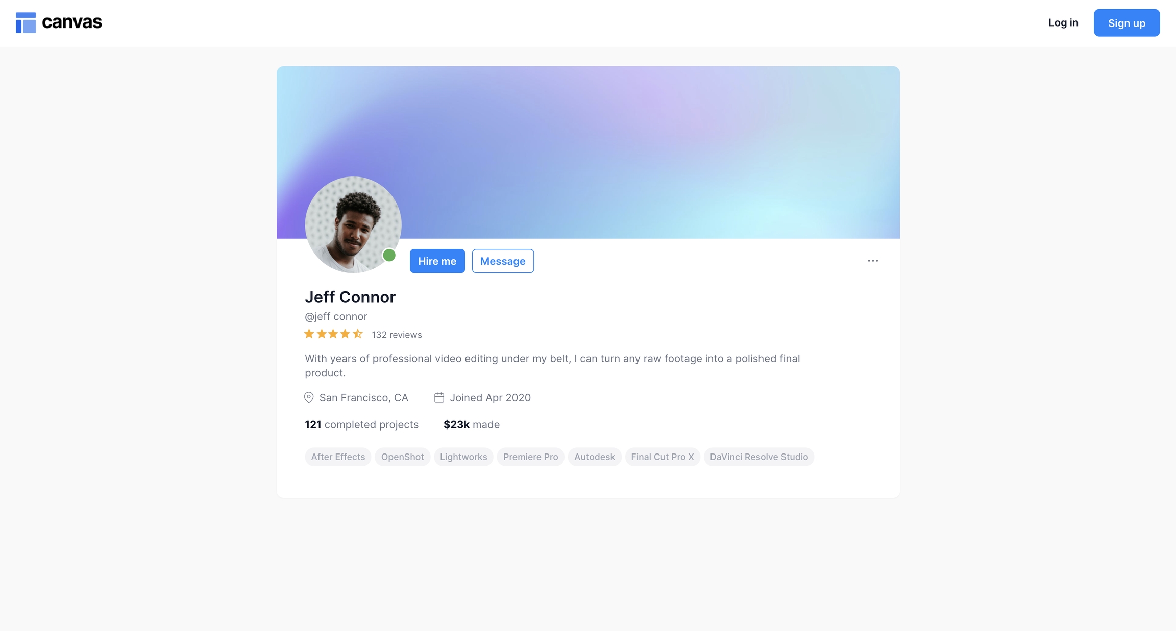 Full layout for a generic left-justified profile page. Includes a profile cover photo, user's image, name, short bio, and other common UI components.