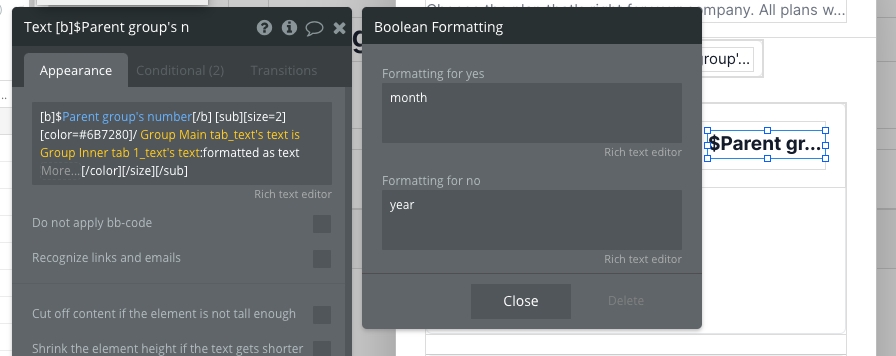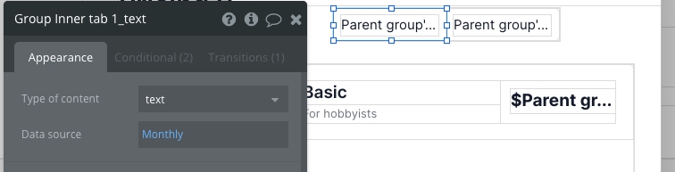 Clicking on each inner tab group will run a workflow to display the inner tab's group text (e.g. Monthly or Annually) in Group Main tab_text and change the current tab view.