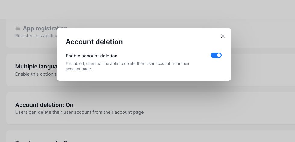 You can enable the account deletion feature for your app users. This will allow users to delete their accounts in your app from their Account page.