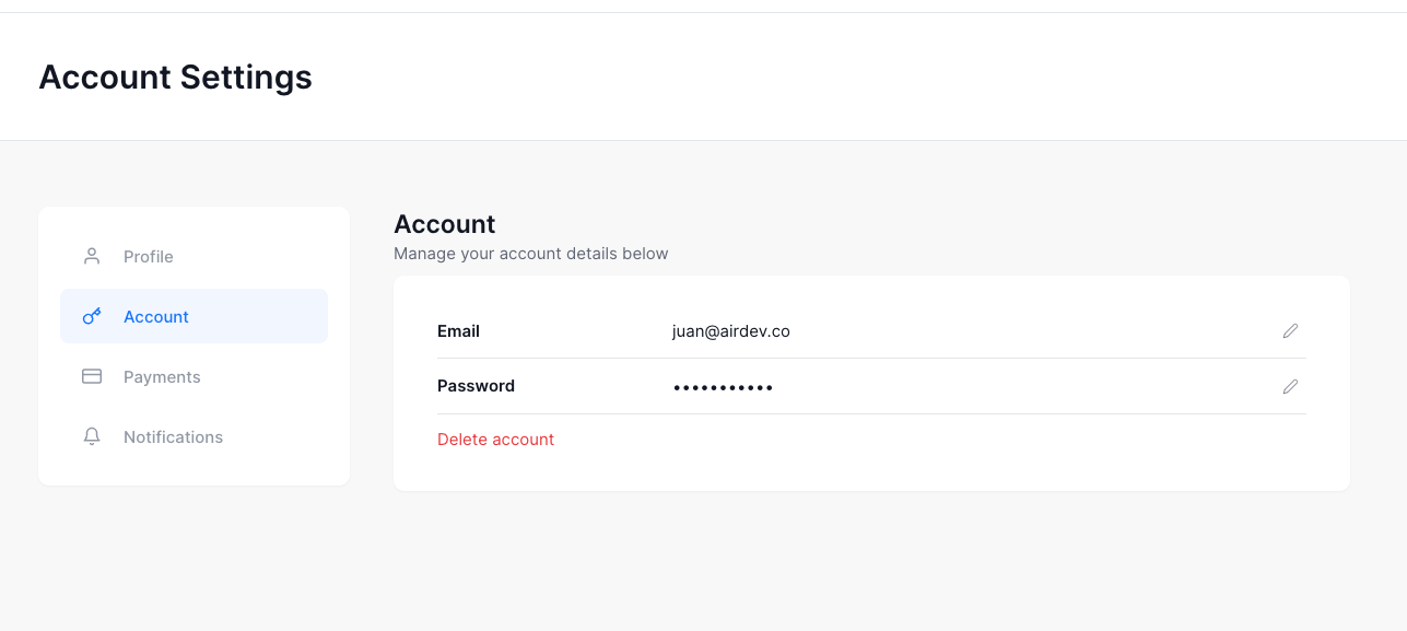If the Account deletion feature is enabled in your app, users are going to have a new option in their Account Settings page -> Account tab, the Delete account button: