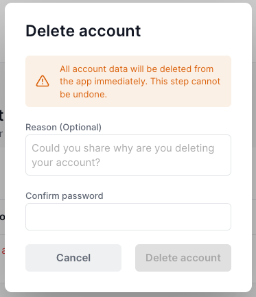 When the user clicks on the button, a popup is shown. From the popup, the user can enter an optional account deletion reason, and is required to enter her/his password to confirm the action.