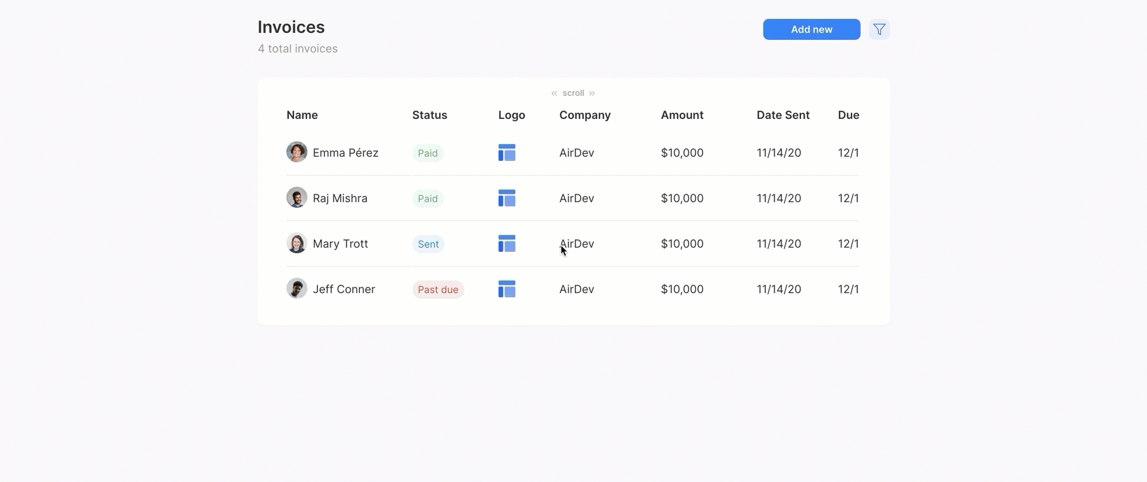 There are placeholder conditionals on the text elements and circular shapes that indicate the "Status" of each Invoice in this example. These style changes can be repurposed if needed, or removed completely.