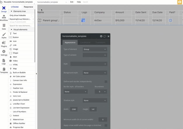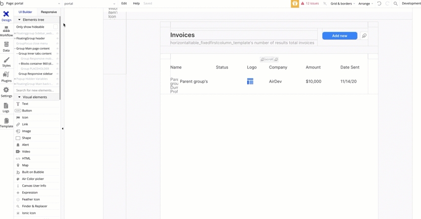 Group Main content container- contains the data table elements and the empty state elementsGroup Main table- contains the table column data (each column has its own hiding rule)Group Main table row container- contains thehorizontaltable_fixedfirstcolumn_templatereusable element and the placeholder group.horizontaltable_fixedfirstcolumn_templatereusable element - contains the list of things that will be displayed in the data table. This repeating group's data source should be changed from "Dummy" to the type of content that you will display.RepeatingGroup Website (DO NOT CHANGE - for horizontal scroll functionality only)- used to make the right side elements horizontally scrollable. Do not delete or modify this element. The repeating group must always contain a single entry for this workaround.Group Main table headings section- contains the data table's column headings.Repeating Group Dummys (infinite horizontal scroll)- This repeating group that holds the main data that is displayed by the table. For demo purposes, we use Arbitrary Text as a data source. Click here to learn how to change the data source.Group Inner customer desktop column title- contains the fixed first column's title.Repeating Group Dummys (fixed-column)- This repeating group allows for the fixed-first column design. This repeating group's data source should exactly match the right-side, scrollable data table. Because the fixed, first column is in a separate repeating group from the scrollable content on its right, the repeating groups must always have the same row size and data source to ensure that everything looks like one table.