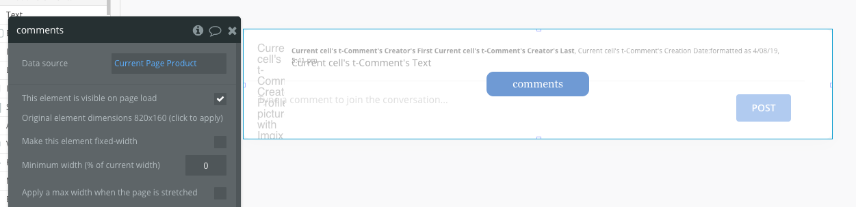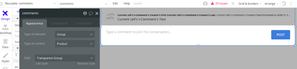 t-Comments. This is the data type that will store all of the comments.All of the comments are displayed in RepeatingGroup t-Comment.