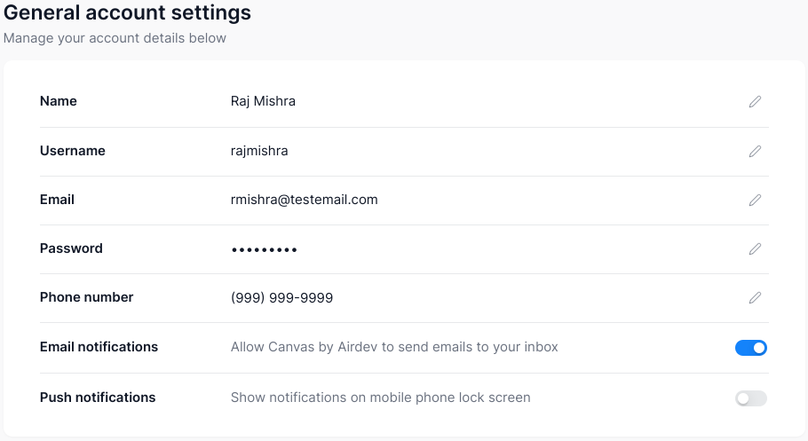 This settings block includes a list of fields, each with an edit icon or a toggle.