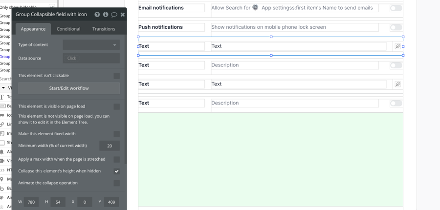This group includes a bolded title, description, and a Canvas toggle. Please ensure your Canvas UI elements plugin is on the latest plugin version (Bubble editor > Plugins > Canvas UI elements). When the toggle value is changed, a workflow to trigger an AirAlert will fire.