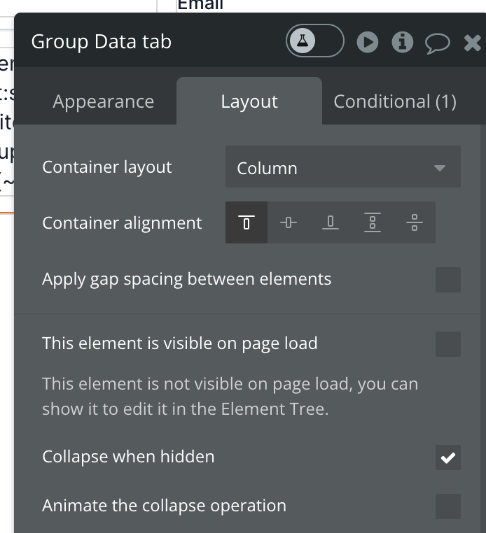 For each block that you add to Group main content - Paste group, uncheck the box for This element is visible on page load and check the box for Collapse this element's height when hidden.