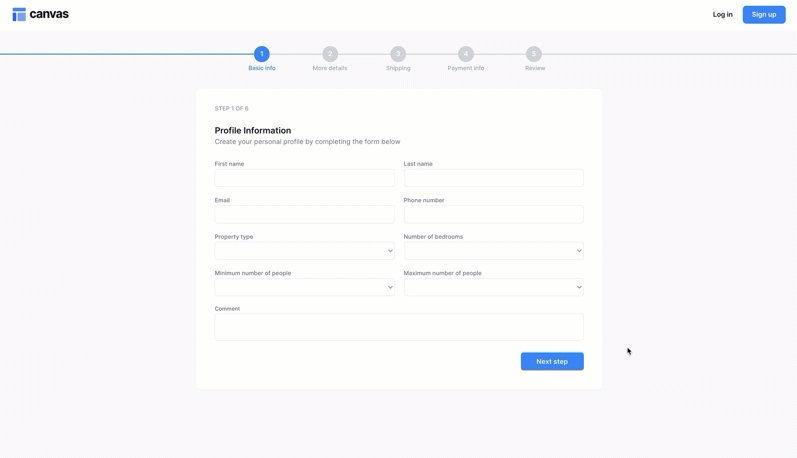This page has a series of forms. Each form constitutes a "step" in the process. Users can go back and forth between steps and see what step they are on via a dynamic progress bar reusable element at the top of the page. This version is ideal for simple forms such as check out process and surveys.