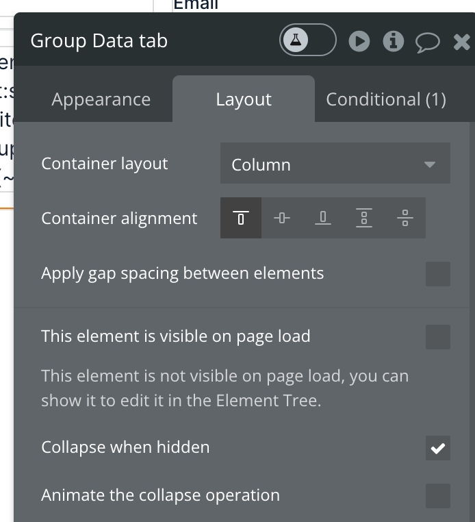 For each block that you add to Group main content - Paste group, uncheck the box for This element is visible on page load and check the box for Collapse this element's height when hidden.