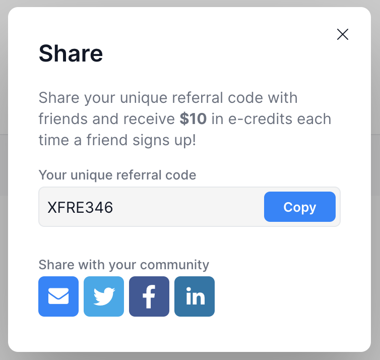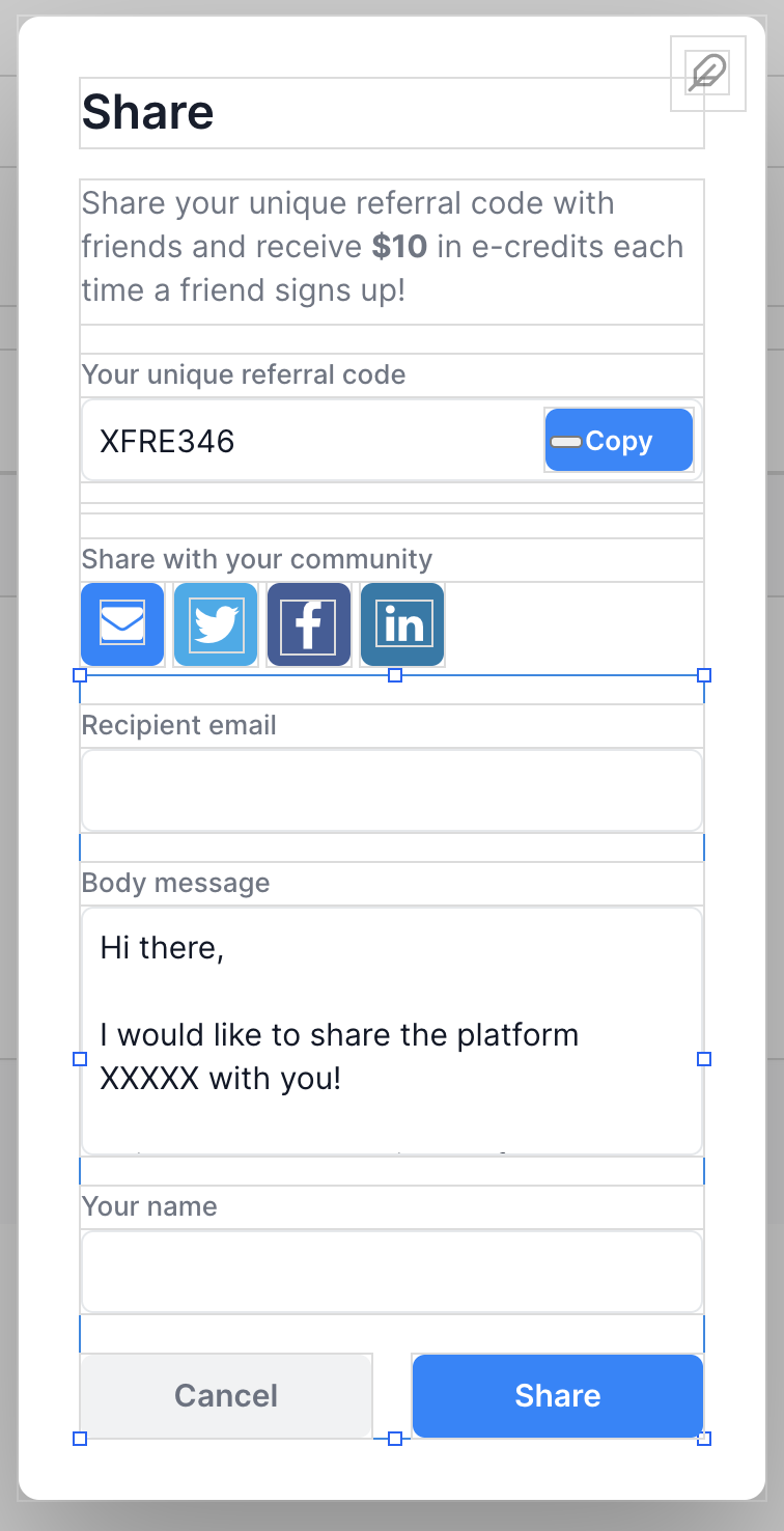 This popup allows you to share the app with a friend via email, Twitter, or Facebook. It also contains UI elements to copy a code to a clipboard (e.g., promo code, referral code), and a short form.
