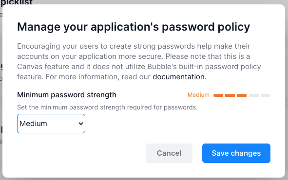 This Canvas feature uses Bubble's password strength feature and not Bubble's built-in password policy feature (App Bubble editor > Settings tab > General tab > Privacy & Security section).